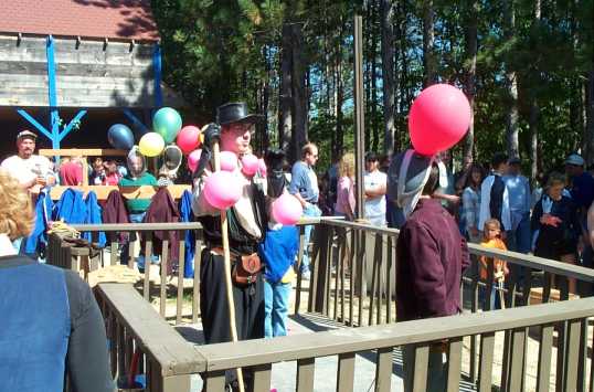 Dan conducts a bunny fencing bout covered in pink balloons. He wore even more balloons than these on his body during the afternoon parade, attracting attention to the bunny fencing booth. [ 538x355 (36 kB) ] |
