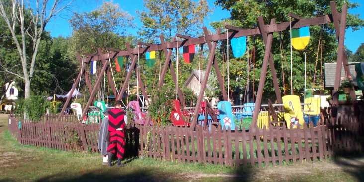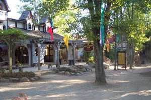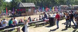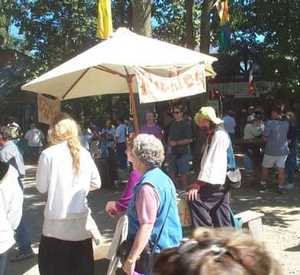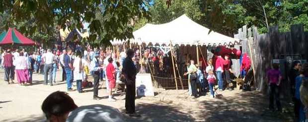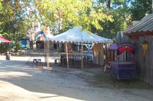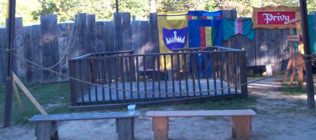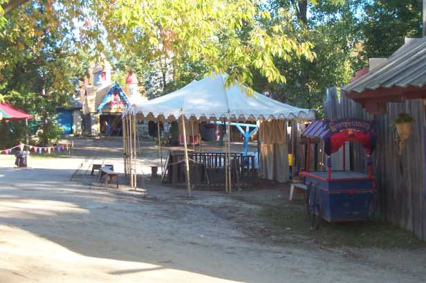 The north bunny fencing booth before setup or festival opening. This booth is not covered by a tent, so the full force of the sun beats down on it all day and makes it the less desirable posting. Rain also forces its closure. It is, however, next to Treetops Stage, used for fencing demonstrations. [ 618x275 (22 kB) ] |