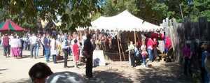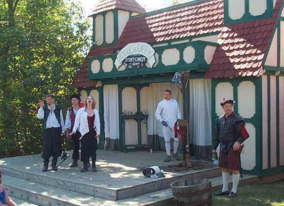 The Treetops Stage, where fencing demonstrations and the Rogue and Rapier show took place. From left: Dave and Aaron (Rogue and Rapier performers), Arielle and Eric (MSU Fencing Club members), and Doug McLaren (Schoolcraft Fencing Club coach). [ 557x405 (33 kB) ] |