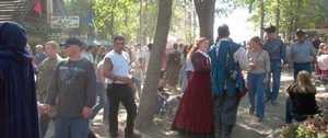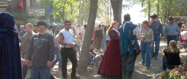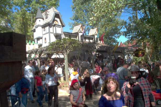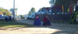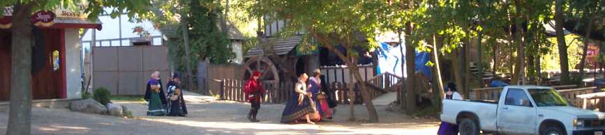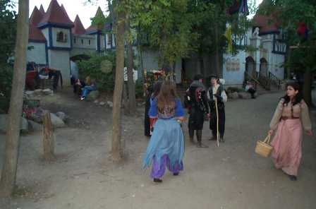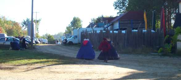 Backstage, Caroline (Queen Elizabeth) and one of her ladies in waiting (``ladies in waiting and training, oh my!'') walks along the perimeter of the festival area, toward the site of the morning meeting. [ 587x261 (15 kB) ] |